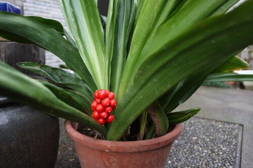 〇気の抜けぬ術後二年や万年青の実 (きのぬけぬじゅつごにねんやおもとのみ) 〇深窓に隠しおおせぬ万年青の実 河童三子 〇実を付けて隅より出さる万年青かな 々 〇門松の裾を装ふ万年青の葉 々