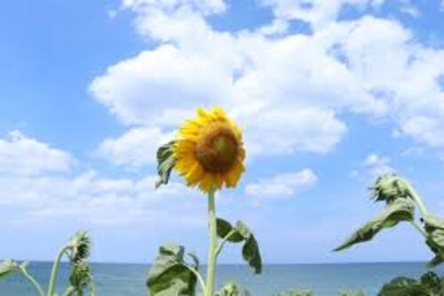 〇海と空従へて向日葵立ってゐる (うみとそらしたがえてひまわりたっている) 〇向日葵や負けず嫌いは母譲り 河童三子 〇真っすぐに立つ向日葵の迷い無し 々 〇ひまわりのソフィアローレン向日葵のごと 々